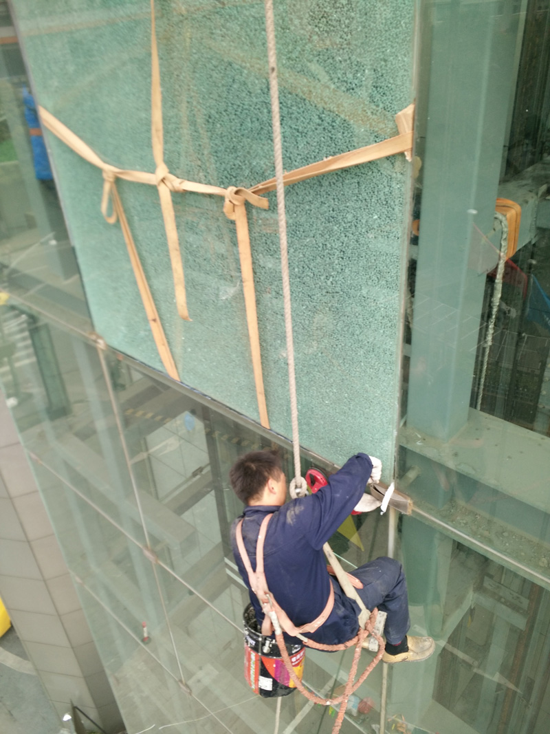 在施工期間的保護(hù)。在施工中通常是用鮮艷的小旗、彩飾帶子等懸掛在玻璃附近或貼附在窗框前方、側(cè)柱或窗臺(tái)上以標(biāo)記出這是安裝玻璃的空間。決不要讓繩索直接觸到玻璃,并且也不要讓記號(hào)或涂料直接畫在玻璃表面上,如果焊接、切割噴沙或者其他可能損傷玻璃的建筑工藝在接近玻璃的地方采用,則必須應(yīng)用膠合板或塑料板作為一層嚴(yán)密的隔離層板以防止它們影響以至損壞玻璃。
